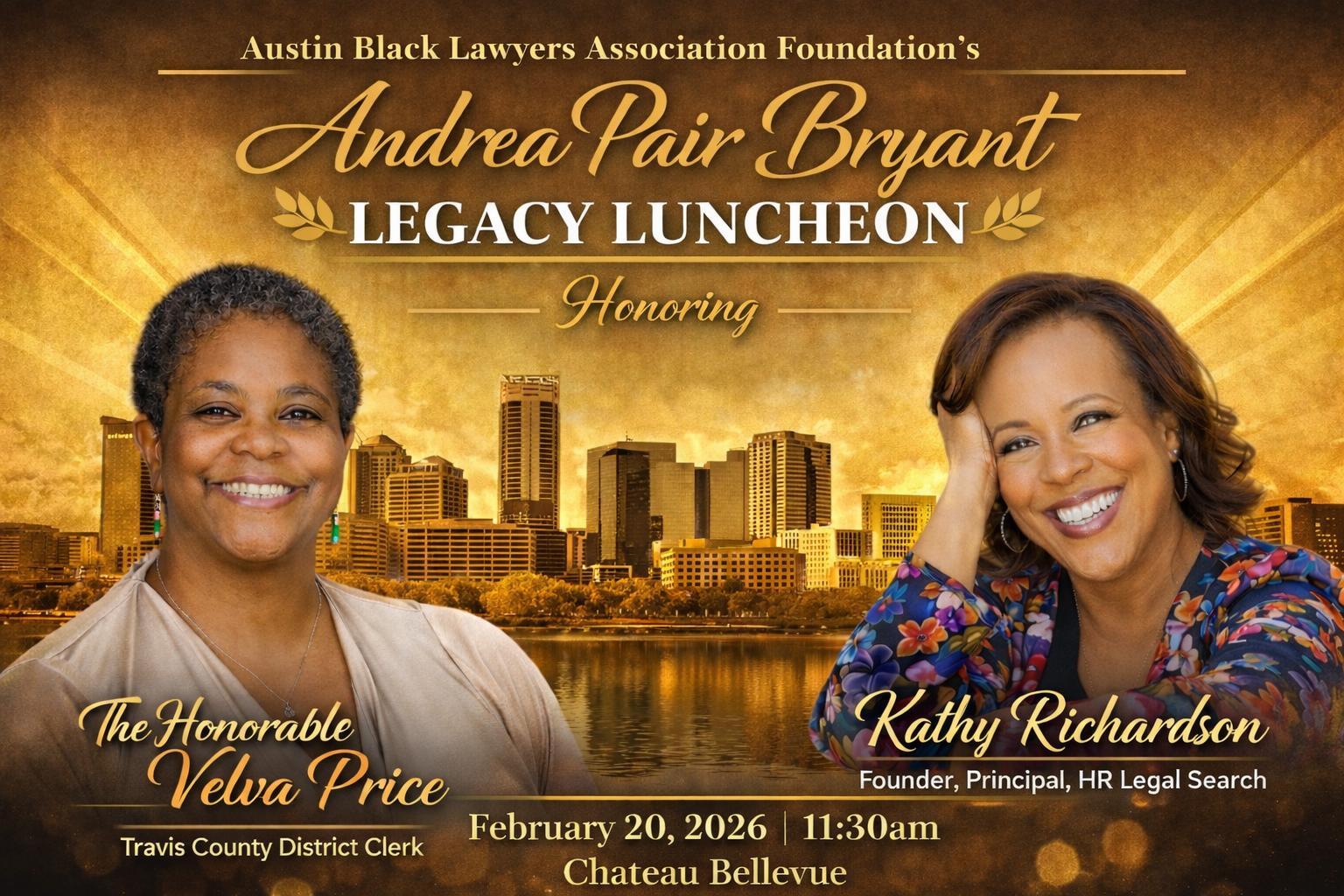 The Austin Black Lawyers Association Foundation Presents the 2026 Andrea Pair Bryant Legacy Luncheon. This event honors the legacy of the late Andrea Pair Bryant, an ABLA founder and celebrated community activist, while celebrating the contributions of trailblazing attorneys and raising funds for Central Texas high school graduates.